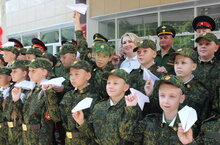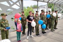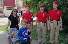 Кадеты поздравили жителей микррайона воздушными шарами цвета флага России и песнями.