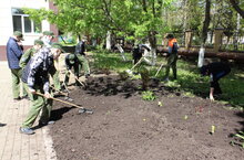 Члены экологического отряда "Землянам о Земле" занимаются озеленением пришкольной территории.