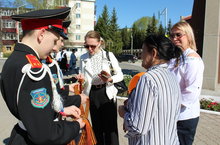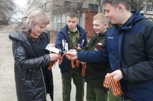 Волонтёры Победы Бугульминской кадетской школы, перед митингом около памятника Героя Советского Союза Газинура Гафиатуллина, раздали горожанам Георгиевские ленточки.