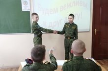 Кадеты 5 класса провели агитбригаду "Будем вежливы друг к другу!". Ребята вспомнили и сказали друг другу вежливые слова и пословицы, посмотрели видеоролик о влиянии слова на воду, уточнив, что организм человека на 80% состоит из воды, и сделали вывод, что нужно чаще говорить добрые слова и отказаться от сквернословия.