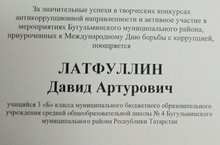 Сегодня ученик 3Б класса Латфуллин Давид и учитель начальных классов Михеева Эльвира Гарифовна были приглашены на встречу с Главой Бугульминского муниципального района Республики Татарстан Закировым Л.Р, где в торжественной обстановке им вручили Благодарственное письмо за значительные успехи в творческих конкурсах антикоррупционной направленности и активное участие в мероприятиях Бугульминского мумницпального района, приуроченных к Международному дню борьбы с коррупцией. Молодцы! Желаем дальнейших творческих успехов!