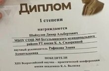 Поздравляем Шайхулова Динара, ученика 8А класса с победой в XIII Всероссийской научно-практической конференции имени академика К. А. Валиева. Желаем Динару и его руководителю дальнейших успехов и побед