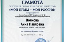Это не просто день в календаре, это повод вспомнить богатейшую историю, уникальную культуру и невероятную природу этого удивительного полуострова, который по праву называют жемчужиной России. Наша ученица 4 класса Волкова Анна участвовала в во Всероссийской образовательной викторине по теме "Мой Крым-моя Россия" и получила грамоту. Поздравляем, молодец! -