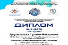 В категории «Техническое конструирование» ученица 6 класса Сумайя Джумалыева заняла третье место. Её наставником и преподавателем труда, который подготовил призёра, является Минутдинова Ильгамия Рушановна.