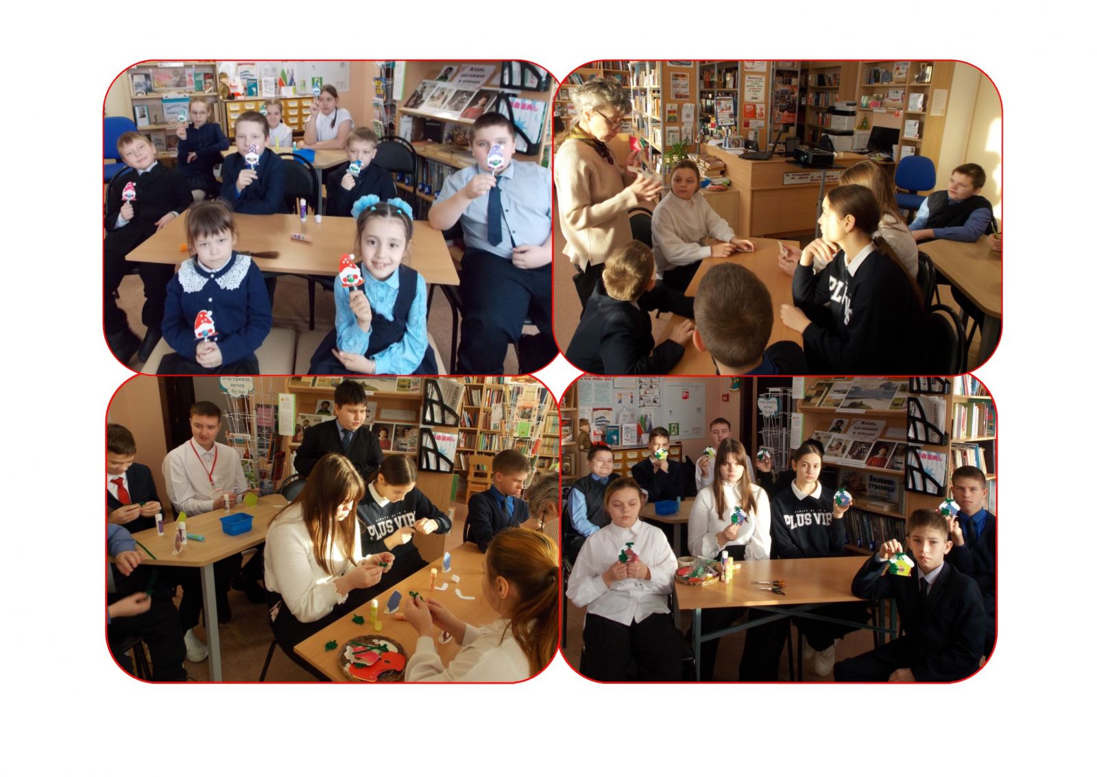 Учащиеся школы прошли мастер-класс по изготовлению сувениров: «Дед Мороз» и «Зимний домик». Сельский библиотекарь показала о правилах создания бомбоньерки (небольшой коробочки, наполненной сладостями), используя цветную бумагу, синельную проволоку, клей, скотч, ленточки, бусины. Во время мероприятия ребята узнали о традициях зимних праздников, ознакомились с произведениями Г.Андерсена, Э.Гофмана, Н.Гоголя, рассказывающие о Новом годе и Рождестве. Созданные своими руками поделки ребята взяли с домой, чтобы украсить ими домашние елки.