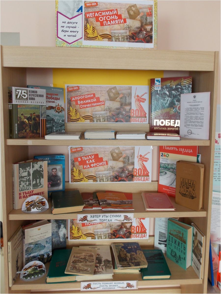 В сельской библиотеке организована выставка «Негасимый огонь памяти» с разделами: «Дорогами Великой Отечественной», «В тылу как на фронте», «Книжный эшелон Победы». Литература, представленная на выставке, ознакомит с историческими фактами: началом Великой Отечественной войны, с ее ходом и завершением, а также вкладом тружеников тыла и ролью России в победе над фашизмом. Особое место на выставке заняли произведения писателей-фронтовиков: М.Шолохова, Б.Полевого, А.Адамовича, В.Закруткина, Ю.Бондарева, В.Некрасова, В.Астафьева, Б.Васильева и других. Прочтение художественной и краеведческой литературы о войне позволит вам прикоснуться к героическому времени, вспомнить воинов-защитников, отстоявших мир в жестокой битве.