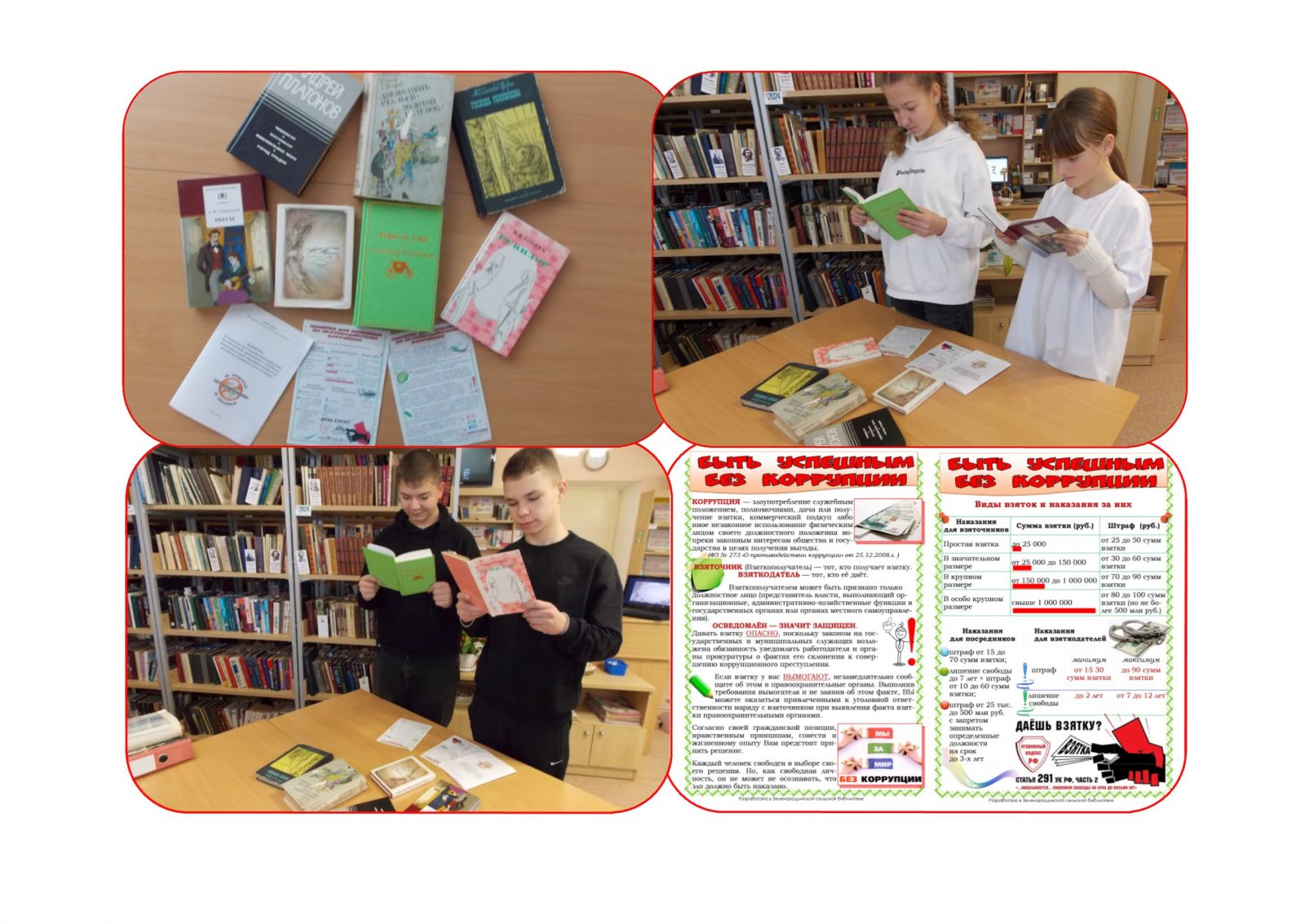 В сельской библиотеке в преддверии Международного дня борьбы с коррупцией прошла буклет-акция «Чиновник и взятка». Учащиеся школы получили сведения об основных методах борьбы с различными видами злоупотребления служебным положением в личных целях, о том какой вред наносит коррупция государственным и частным структурам. Также был предложен список произведений Н. Гоголя, М. Салтыкова-Щедрина, А. Островского, Д. Фонвизина, М. Зощенко, в которых ярко описывается тема взяточничества. Красочные дайджест-буклеты помогут ребятам сформировать нравственный образ жизни в соответствии с нормами, принятыми в обществе и быть «чистым» перед законом государства.