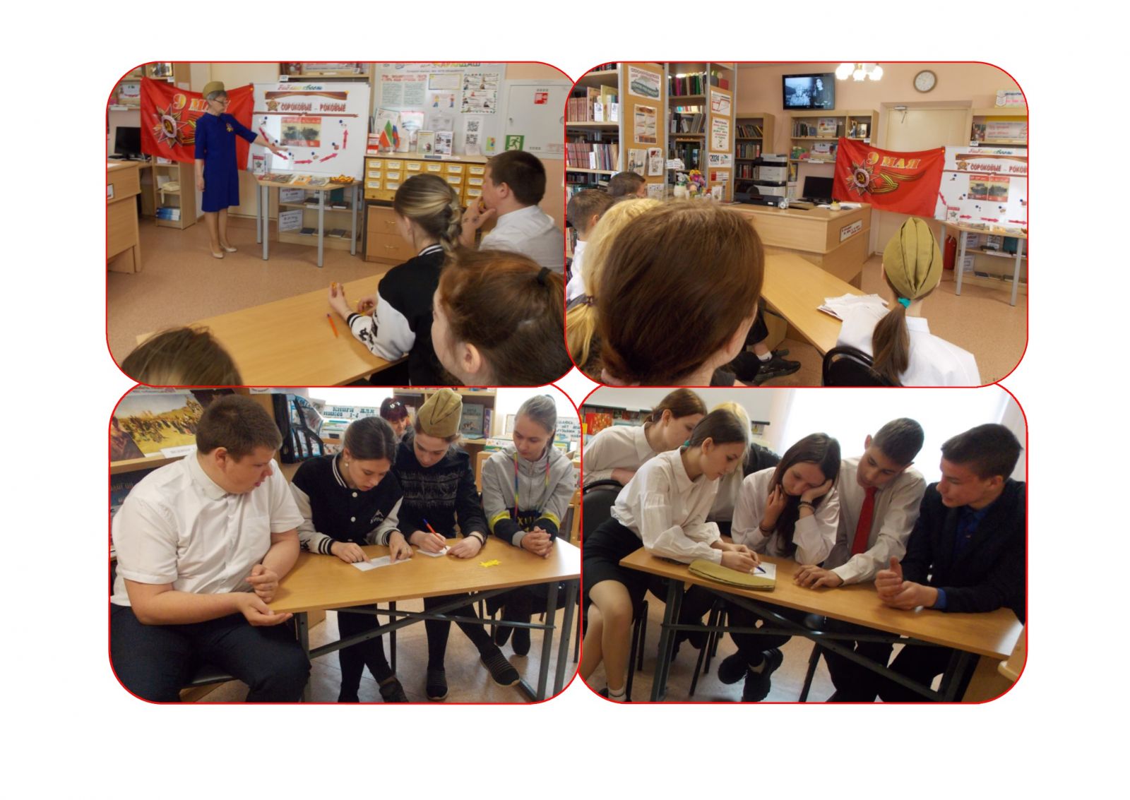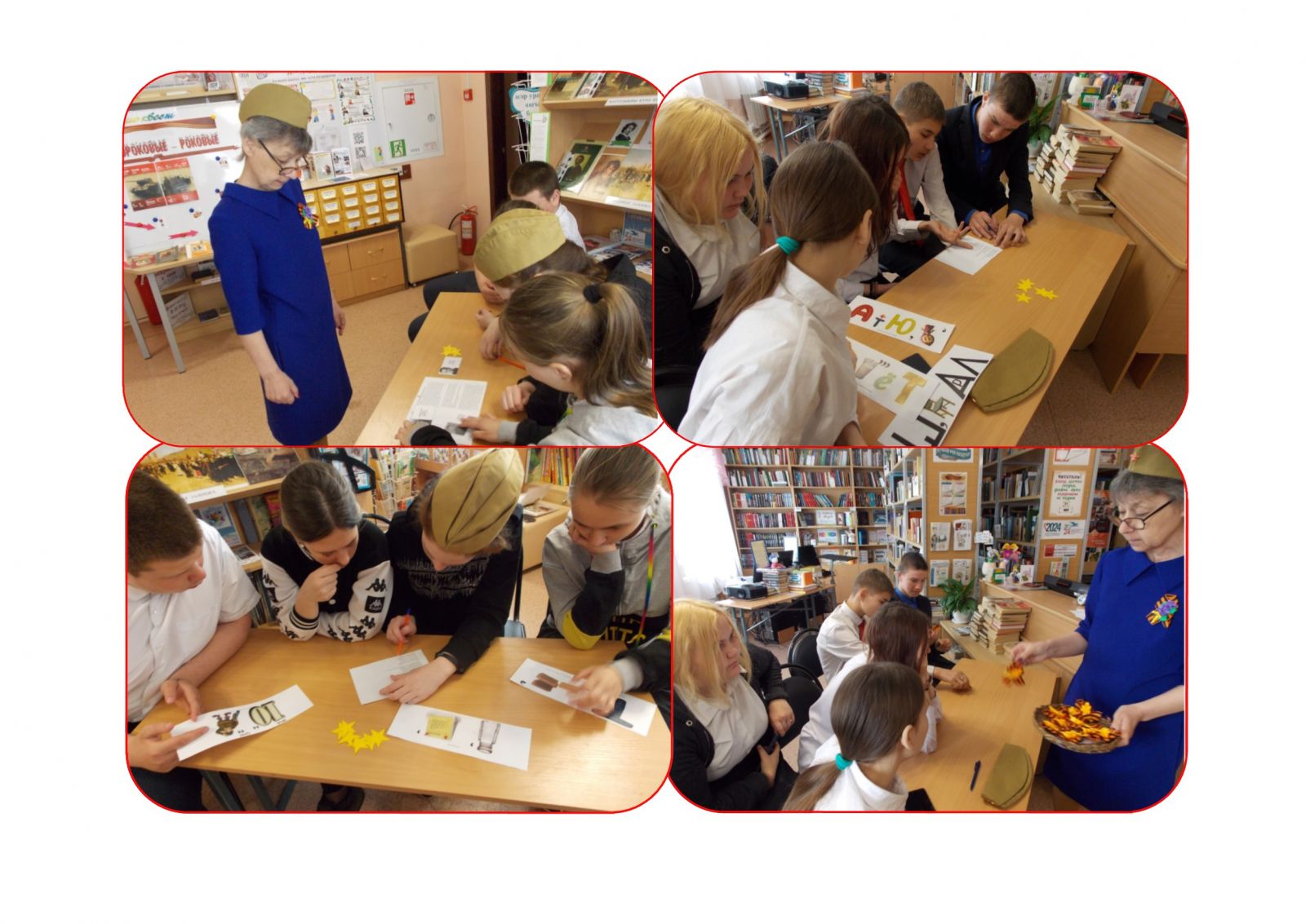 Учащиеся 8-9 классов были приглашены в сельскую библиотеку на литературно-исторический квест «Сороковые-роковые». Они были поделены на 2 отряда, каждому из которых нужно было пройти 6 станций: «Снайпер», «Шифровальщики», «Музыкальная», «Смекалка», «Бугульминцы-герои», «Книги о войне». При оценке выполненных заданий, связанных с периодом Великой Отечественной войны (1941-1945), учитывались не только знания, но и сплоченность и организованность отрядов. В завершение литературно-исторического квеста библиотекарь обратила внимание учеников на выставку, где расположились произведения писателей-фронтовиков. На протяжении всего мероприятия на экран проецировались фотодокументы и звучали музыкальные фрагменты военных лет. В завершение квеста библиотекарь вручила читателям георгиевские ленты – символ героизма, воинской доблести и славы защитников России.