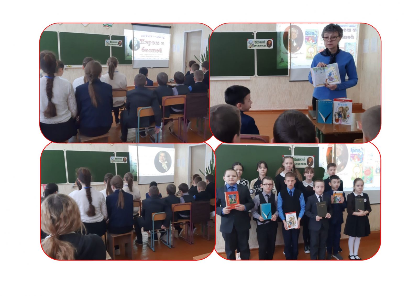 Сельский библиотекарь предложила учащимся и педагогам ознакомиться с информ-досье «Пером и басней», где содержалась информация о русском баснописце публицисте Иване Андреевиче Крылове, многие фразы и выражения из его произведений стали фразеологизмами в русском языке. Кроме этого, ребята и учителя приняли участие в викторине по басням Крылова, ответив на задания пяти туров «Найди пару», «Узнай басню по рисунку», «Отгадай ребус», «Стол находок», «Расшифруй название».