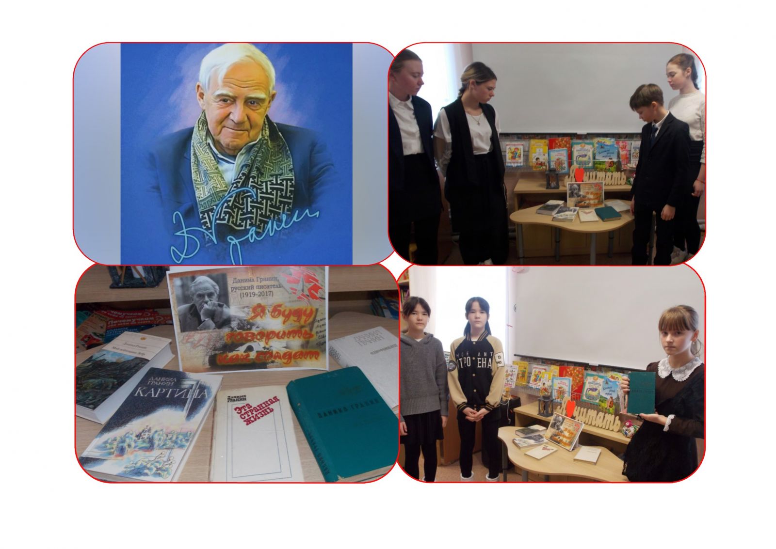 В сельской библиотеке организована книжная выставка «Я буду говорить как солдат», посвященная юбилею Даниила Гранина – российского писателя, участника Великой Отечественной войны. Его произведения проникнуты искренней любовью к людям, к России, её великой истории и традициям, поднимают важные нравственные, мировоззренческие проблемы. На экспозиции представлены литература о творчестве писателя, его художественные и публицистические произведения, а также совместный труд с А.Адамовичем «Блокадная книга». Красной нитью выставки стали слова-завещание Д. Гранина «Прощать, но помнить... Помнить, но прощать...»