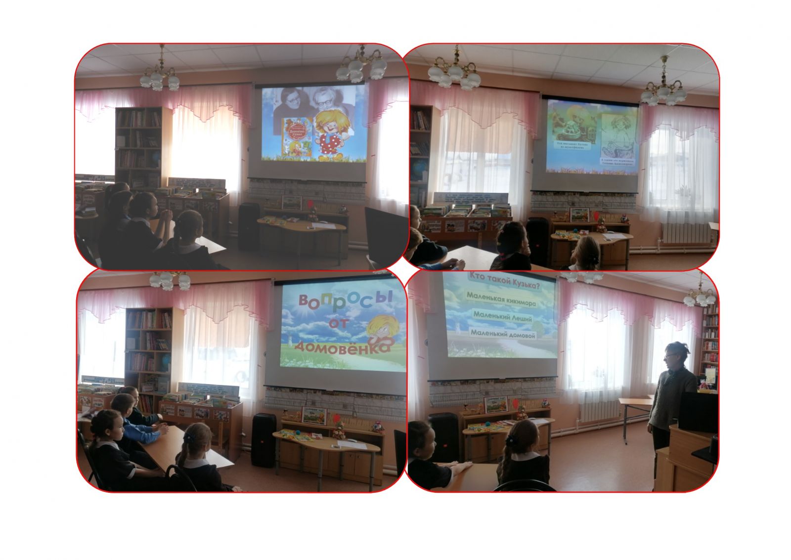 Учеников 1-4 классов сельский библиотекарь пригасила поиграть в литературное лото «Кто под веником живёт?» по сказке Татьяны Александровой «Домовёнок Кузька». Сначала ребята ознакомились с основными этапами жизни и творчества писательницы. Рассказ сопровождался яркими слайдами, на которых отразились красочные иллюстрации, передающие характеры сказочных персонажей. Затем ребята выполняли задания: лист бумаги разделен на квадраты, в каждом – описание одного из героев книги Александровой, задача игроков найти из предложенных карточек изображение нужного персонажа и поместить её на заданный квадрат. В заключение литературного лото ребята посмотрели фрагмент мультфильма «Дом для Кузьки», снятый по мотивам сказки Татьяны Александровой и смастерили из бумаги домовёнка.
