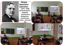 Для учащихся школы прошло мероприятие «Великий голос России», посвященное 150-летию гениального певца Федора Ивановича Шаляпина. Выходец из бедной деревенской семьи, подлинный народный самородок, пробившийся из низов к лучшим мировым сценам, чье имя даже спустя более 70 лет после смерти остается одним из главных «брендов» отечественной культуры. Учащиеся познакомились с основными этапами жизни и творчества Ф. Шаляпина. Мероприятие сопровождалось небольшим видеороликом, фото и прослушиванием некоторых арий из его репертуара.
