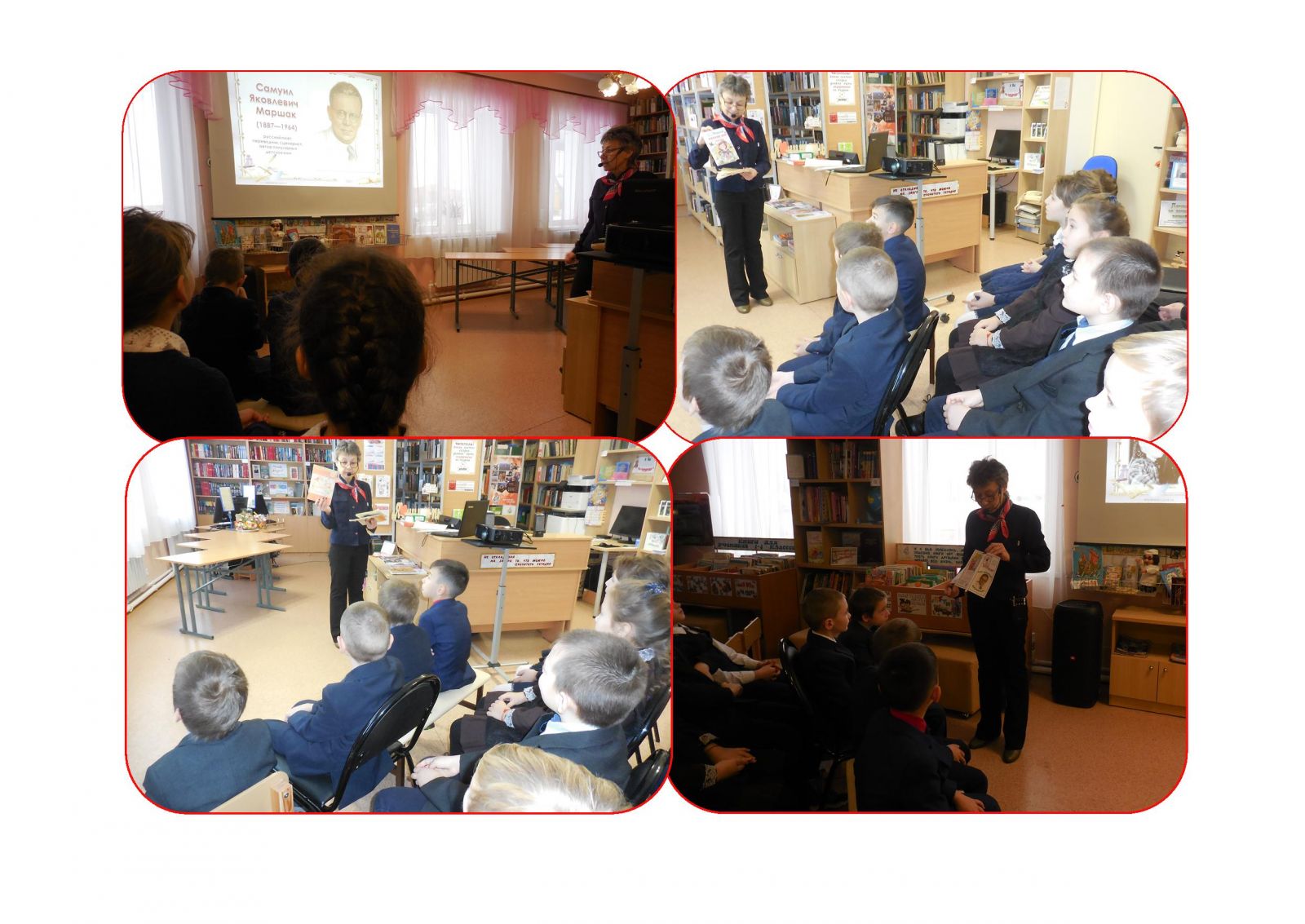 Сельский библиотекарь для учеников 1-4 классов организовала литературное знакомство с творчеством С. Маршака. Ребята не только ознакомились с фактами из биографии поэта, но и прекрасно справились с предложенными заданиями: угадывали названия стихотворения С.Маршака по прочитанному отрывку, из какого произведения показанные предметы, исправляли ошибки в названиях стихов поэта и решали кроссворд, играли в игру «Доскажи словечко» и вспоминали «Сказку о глупом мышонке». Выполнять задания помогла им красочная книжная выставка «Звонкие стихи Маршака». В заключение дети получили красочные буклеты с биографическими данными и иллюстрациями из поэтических произведений Маршака.