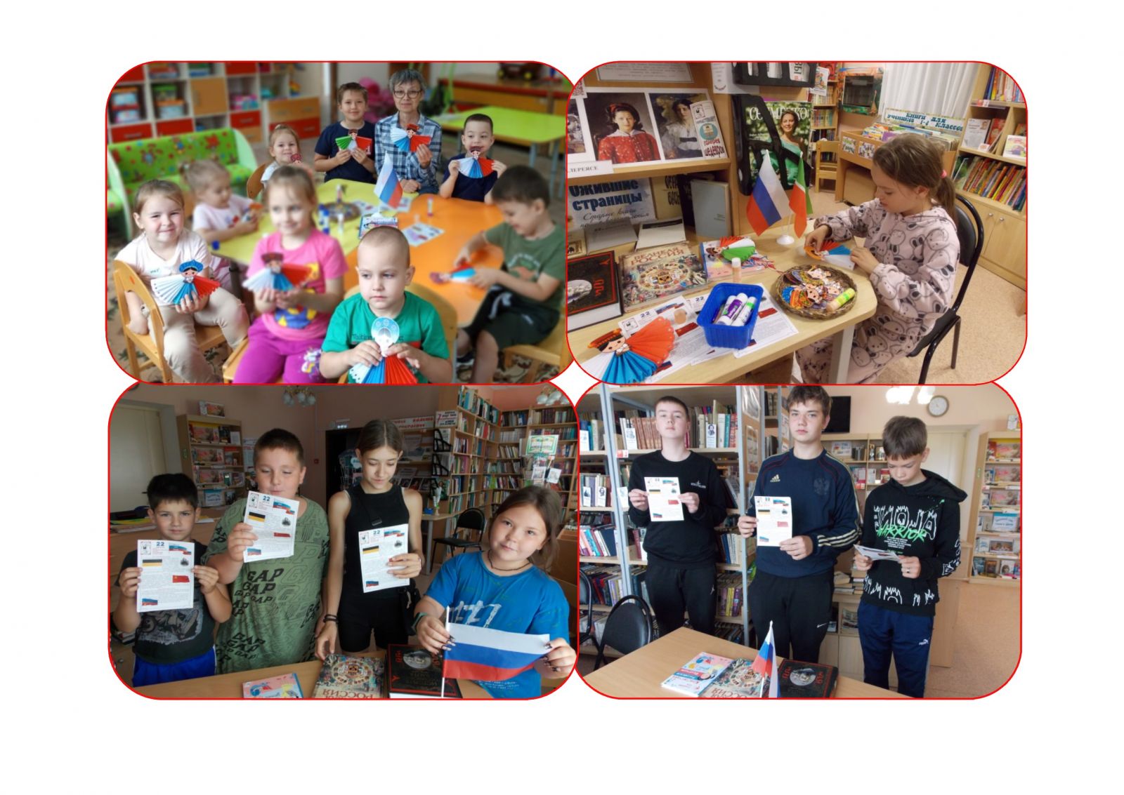 В сельской библиотеке в день празднования флага России среди учащихся была организована акция по распространению флаера «Флаг России – гордость наша». В полиграфическом издании опубликована краткая история Государственного стяга, почему на нем именно так расположились цвета и что они символизируют, где постоянно поднят Государственный флага Российской Федерации. Кроме этого, во флаере можно было найти стихи, пословицы, поговорки о флаге и Родине, а также список книг, рассказывающих о символике государства.