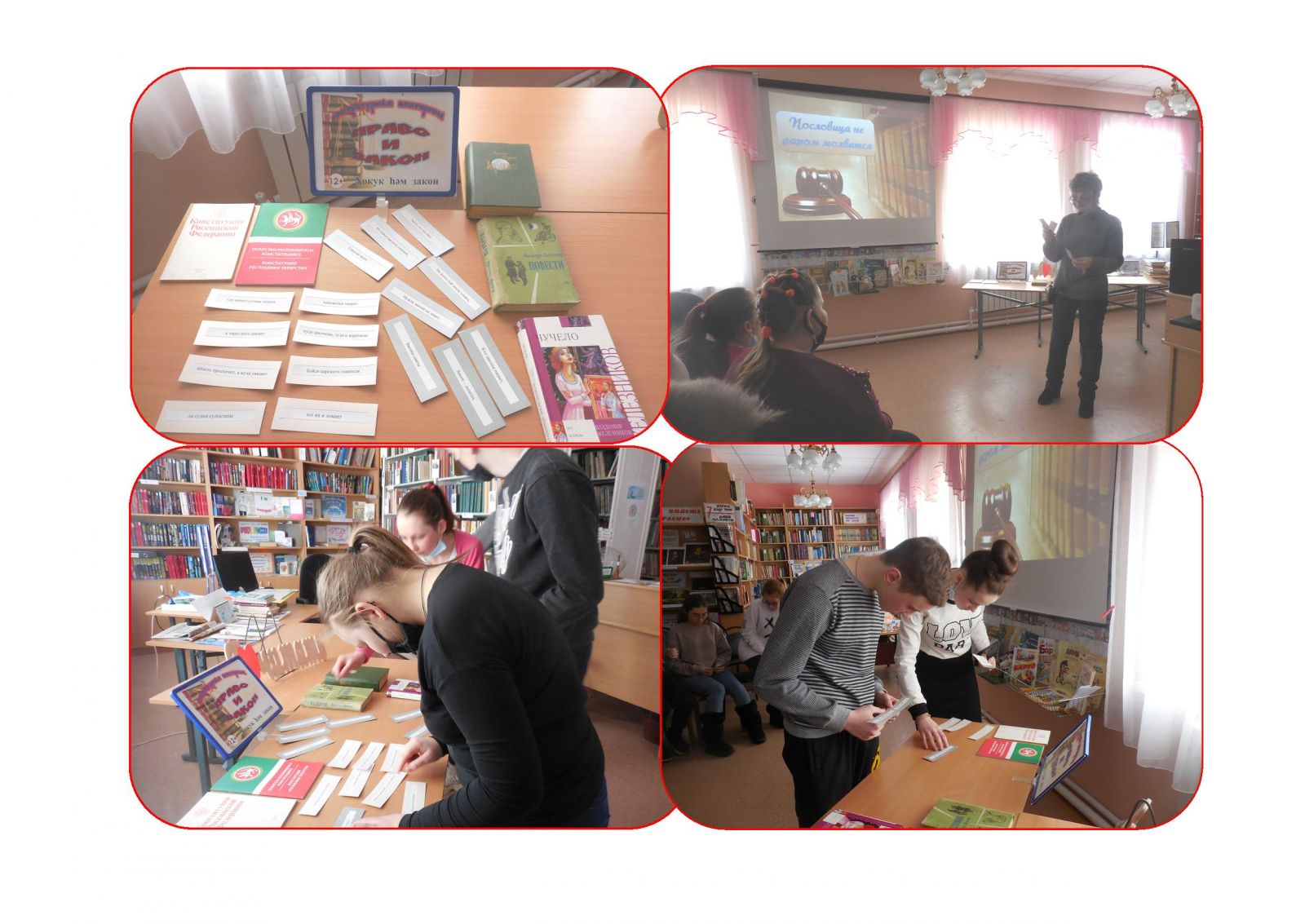 В рамках празднования Недели детской и юношеской книги в сельской библиотеке ученики 6-9 классов участвовали в литературной викторине «Право и закон». Ребята отвечали на вопросы, связанные с ответственностью перед обществом и законом, основываясь на поступки литературных героев, например: в какой известной сказке С.Я. Маршака нарушено право ребенка на заботу? («12 месяцев»), вспоминали литературных персонажей, которые нарушали право на жизнь (серый волк, Кощей Бессмертный, Карабас Барабас) и т.д. Лучшим знатокам викторины были вручены флаеры с рекомендательным списком книг о правах школьников.