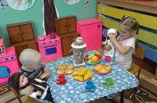 Дети в возрасте 2-3 лет активно осваивают навыки окружающего мира. Они впитывают в себя все, что видят, стараются подражать взрослым. Самое время в игровой форме освоить азы этикета. Ребята младшей разновозрастной группы очень любят играть в сюжетно-ролевые игры. Вместе с воспитателем они решили пригласить кукол на чаепитие. Малыши сначала вспомнили, какую посуду они знают и для чего она нужна. Вспомнив правила сервировки стола, ребята самостоятельно накрыли стол для гостей. Разложили блюдца, чашки. Как только стол был готов, они пригласили кукол к столу, проявили заботливое отношение к ним.