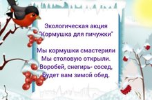 Скоро зима. Наступает самое суровое и голодное время года для наших пернатых друзей. В наших силах помочь им. Не оставайтесь равнодушными! Подкормите птиц зимой, а весной и летом они отблагодарят нас. В нашем детском саду проходит экологическая акция "Кормушка для пичужки". Дорогие родители сделайте, пожалуйста, кормушку и дети смогут не только наблюдать за птицами, но и научатся заботится о братьях наших меньших. Ведь так важно воспитать в ребенке заботу и доброту. Присоединяйтесь!