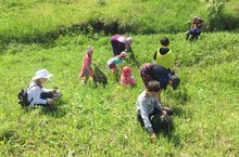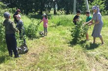 Мәктәп яны лагерена йөрүче укучылар белән карлыган куагы яфракларын җыйдык.