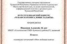 В апреле 2012 года в Чувашском книжном издательстве проходил III Республиканский конкурс «Чувашская книга. Юные таланты». Ученик 10 класса Никонов Алексей в конкурсе сочинений «Моя любимая книга» занял 2 место (руководитель - учитель родного языка и литературы Ложкова С.А.). Поздравляем Алексея с победой!