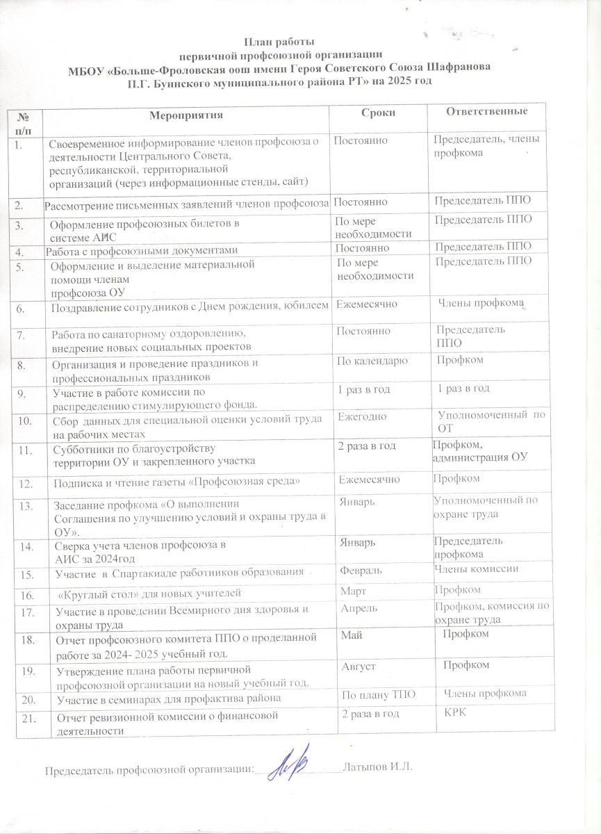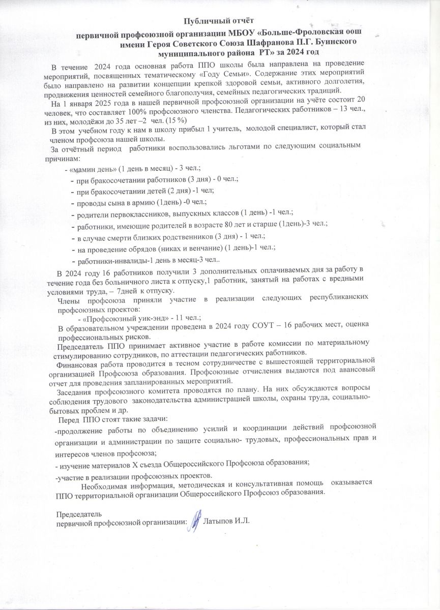 Председатель первичной профосоюзной организации МБОУ "Больше-Фроловская ООШ им Шафранова П.Г.  Буинского района РТ" ---- Латыпов Ильдар Лензович , телефон:  89510606224, электронная почта: ildarlatipov@mail.ru