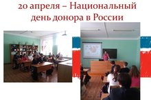 20 апреля - национальный день донора в России. С целью пропаганды добровольного донорства в молодежной среде в нашей школе был проведен классный час среди 6-9 классов по теме «Спасая жизни!».Учитель Хайруллина Д.Ю. рассказала об истории возникновения донорства в России и о популяризации добровольного донорства .