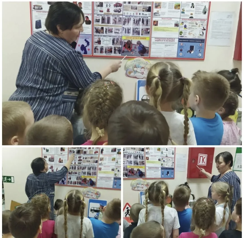 В уголке безопасности мы рассмотрели стенд с картинками, где дети рассматривали их и обсуждали, те или иные ситуации.