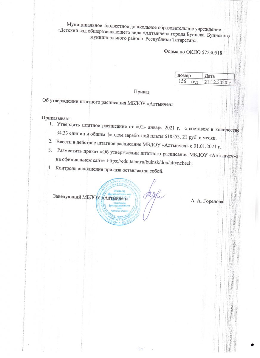 Приказ "Об утверждении шататного расписания МБДОУ "Алтынчеч" на 2021 г."