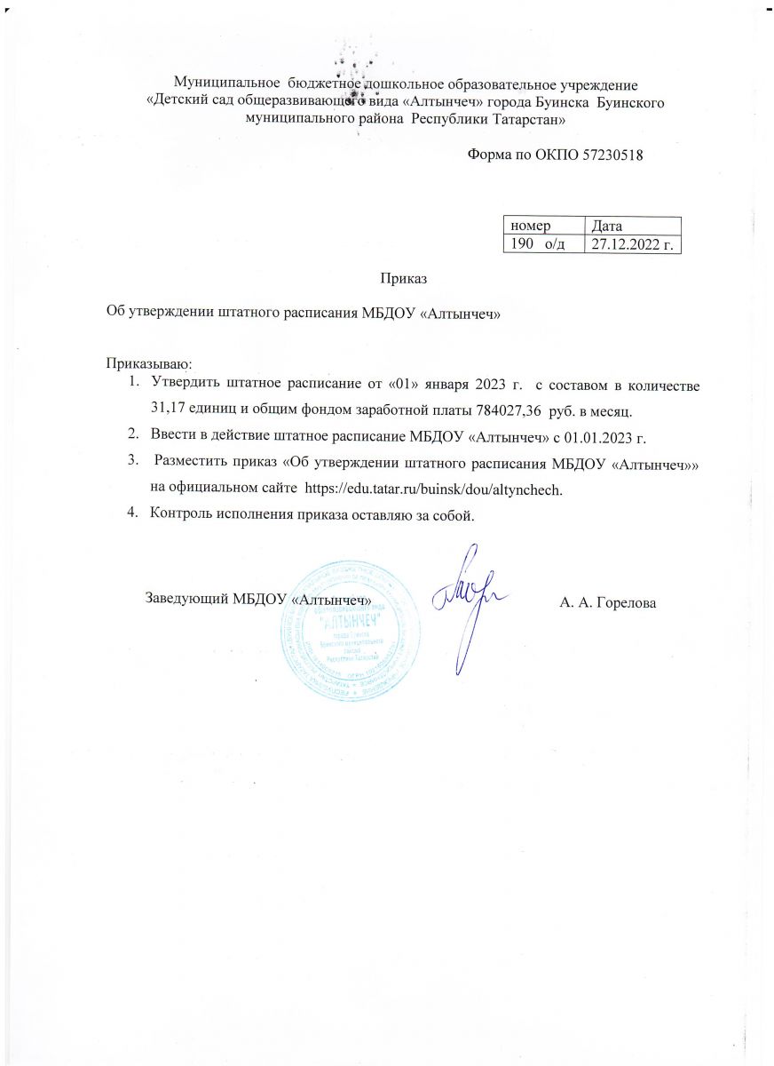Приказ "Об утверждении штатного расписания в МБДОУ "Алтынчеч" на 01.01.2023 г."