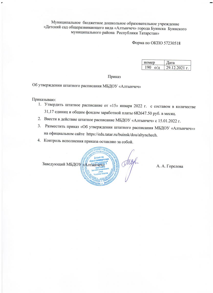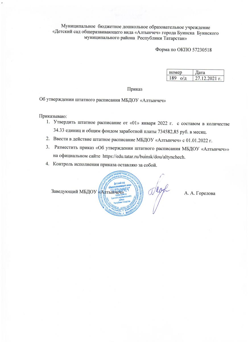Приказ "Об утверждении штатного расписания в МБДОУ "Алтынчеч" на 01.01.2022 г."