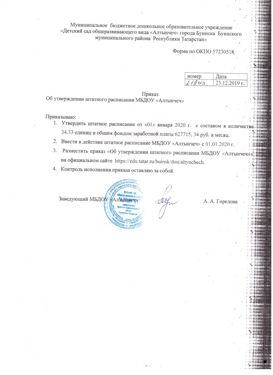 Приказ "Об утверждении штатного расписания МБДОУ "Алтынчеч" на 2020 г."