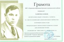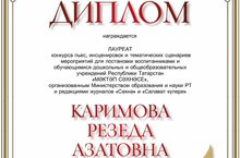 Воспитатель по обучению татарскому языку МБДОУ "Ромашка" Каримова Р.А стала лауреатом конкурса пьес , инсценировок и тематических сценариев мероприятий для постановки воспитанниками и обучающимися дошкольных и общеобразовательных учреждений Республики Татарстан "Мәктәп сәхнәсе" организованным Министерством образования и науки РТ и редакциями журналов "Сәхнә" и "Салават күпере".