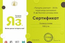 27.10 2018 г. воспитатели МБДОУ "Ромашка" Ахмадуллова А.М. и Исмагилова Г.И. приняли участие в акции "Ботендөнья татарча яза!", где были удостоены сертификатом с оценкой - 5.