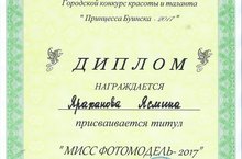 17 мая 2017 г. в Досуговом центре состоялся конкурс "Принцесса Буинска - 2017". Наш детский сад представила воспитанница 1 подготовительной к школе группы Яраханова Я., которая была награждена дипломом в номинации "Мисс фотомодель".