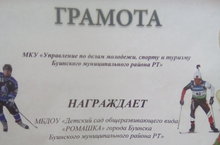 МКУ "Управление по делам молодежи, спорту и туризму Буинского муниципального района РТ" наградил грамотой МБДОУ "Ромашка" за активное участие в веломорофоне среди детей дошкольного возраста, приуроченного ко Дню парков и скверов.