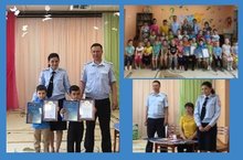 Сегодня в гостях в МДОУ « Солнышко» были Галимова Н. М.- инспектор по делам несовершеннолетних МВД России по Буинскому району, Салахов Р. Ф.- начальник по работе с личным составом МВД России по Буинскому району и Шакурова Р.Р.- председатель Совета ветеранов. Они в торжественной обстановке вручили воспитанникам А. Абикееву и Т. Галимову Дипломы и Благодарности за творческие успехи, художественный талант и активное участие на конкурсе детского рисунка «Мои родители работают в полиции», проведённом МВД РФ под знаком 300- летия российской полиции. Поздравляем! -