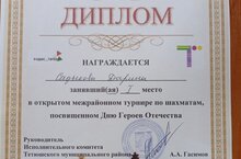 9 декабря в Тетюшском муниципальном районе проходил открытый межрайонный турнир по шахматам, посвященный Дню Героев Отечества. Наша ученица, Садыкова Дарина ,( руководитель Гиззатуллин Ш С ) заняла 1 место. Поздравляем с победой!!! 09.12.2022
