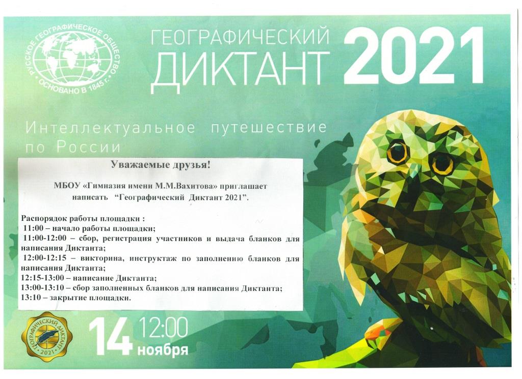 МБОУ «Гимназия имени М.М.Вахитова» пятый год подряд является базовой площадкой по проведению ежегодной международной просветительской акции «Географический диктант» в очной форме. Диктант проводится с целью популяризации географического образования и мотивации различных слоев населения к изучению географии родной страны.