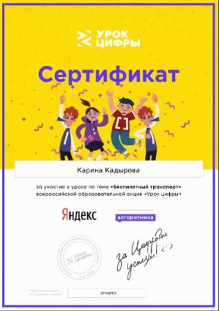С 15 по 18 марта провели тематические уроки «Урок Цифры» по теме «Беспилотный транспорт», направленные на инициирование и поддержку интереса к изучению информатики и программирования, повышение престижа ИТ-специальностей для молодых людей. На уроках было обеспечено прохождение учениками профориентационного теста и онлайн-тренажера. Все участники теста и онлайн-тренажера получили сертификаты.