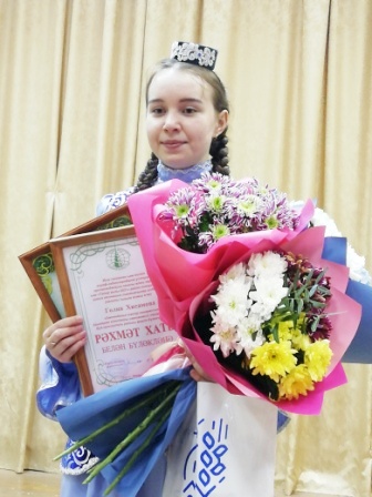 25 февраля в ДШИ №1 состоялся конкурс “Татар кызы – 2021” среди девушек района. В конкурсе участвовала ученица 11 класса Хисамова Гулия. Она достойно прошла все этапы районного конкурса и была награждена грамотой МБУ “Районный дом культуры”, благодарственным письмом Буинского отделения общественной организации «Ак калфак».