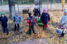 Воспитанники соблюдают чистоту и порядок в детском саду. И учатся навыкам использования метлы и граблей.
