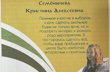 Завершились выборы президента школы и вот результат: - Филиппова Камилла - 15% - Вергасова Татьяна - 41% - Семенычева Кристина - 44% Поздравляем Кристину с победой на выборах и желаем активной и продуктивной работы на посту президента школы!