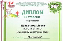 Социаль реклама VIII Республика экологик конкурсында («Фото-плакат» номинациясе) II дәрәҗә диплом алган 1 сыйныф укучысы Шайдуллова Л. ны котлыйбыз!!!