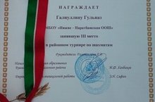 Район шахмат ярышларында катнашып, 6 сыйныф укучысы Галиуллина Гөлназ кызлар арасында шәхси беренчелектә 3 урынга лаек булды. Гөлназны бу җиңүе белән кайнар котлыйбыз, киләчәктә мәктәп данын шулай уңышлы яклавын теләп калабыз.Ул Мактау кәгазе һәм медаль белән бүләкләнде. (Җитәкчесе : Гыйзәтуллина Г.Р.) 15.02.2016