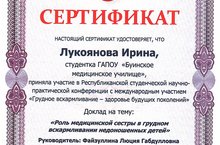 Республиканская студенческая научно-практическая конференция 21.11.2022 Студентка ГАПОУ «Буинское медицинское училище» Лукоянова Ирина приняла участие в Республиканской студенческой научно-практическая конференции с международным участием «Грудное вскармливание – здоровье будущих поколений». Доклад на тему: «Роль медицинской сестры в грудном вскармливании недоношенных детей», на базе ГАПОУ «Казанский медицинский колледж». Руководитель: преподаватель специальных дисциплин Файзуллина Люция Габдулловна.