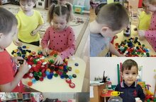 Художественно- эстетическое развитие (лепка) " Витамины в баночке". Дети второй группы раннего возраста научились разминать руками пластилин, отщипывать маленькие кусочки от куска пластилина и катать из них шарики.Надавливая на шарик, прикрепляли его к основанию.