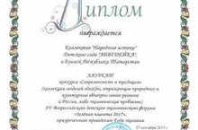 Коллектив "Народные истоки" МБДОУ "АБВГДЕЙКа" стал Лауреатом конкурса "Современность и традиция" XV Всероссийского детского экологического форума "Зеленая планета 2017" и награжден Дипломом.
