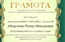 За активное участие в лыжных гонках заведующую детским садом "АБВГДЕЙКА" Абидулину Резеду Мансуровну наградили грамотой начальника МКУ "Управление образования Буинского муниципального района". Поздравляем от всей души!