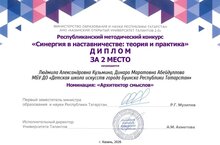 В марте 2026 года, на базе АНО " Казанский открытый университет талантов 2.0" , при поддержке МОиН РТ, в рамках реализации Концепции развития и реализации интеллектуально-творческого потенциала детей и молодежи РТ «Перспектива», был объявлен Республиканский методический конкурс "Синегерия в наставничестве: теория и практика", целью которого является повышение уровня педагогического мастерства путем обмена лучших практик наставничества, поддержка профессионального роста педагогов . И.о.директора Л.А. Кузьмина и зам. директора по учебной работе Д.М.Абейдуллова Детской школы искусств Управления образования, приняли участие в конкурсе в номинации "Архитектор смыслов" и были награждены Дипломом 2 степени, а статья "История школы в событиях и лицах" будет опубликована в методическом сборнике, в разделе "Воспитательная работа в образовании".