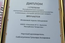 Исхакова Адиля - учащаяся ДШИ, отделение ДПИ на базе МБОУ "Гимназия №5 г.Буинска РТ", награждена Дипломом 1 степени Республиканского конкурса "Галактика информационной безопасности" в номинации "Лучший авторский проект". Руководитель Сибгатуллина Гульнара Ансаровна. Поздравляем!