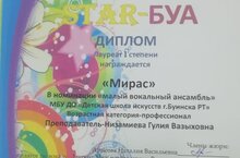 "Шатлык нуры" балалар сәнгать мәктәбенең вокал ансамбле - җитәкчесе Таҗетдинова Наилә Наил кызы, Казан шәһәренең "Созвездие - Йолдызлык" ХХІІ фестиваленең Казан шәһәрендәге суперфиналының II турында катнаштылар.